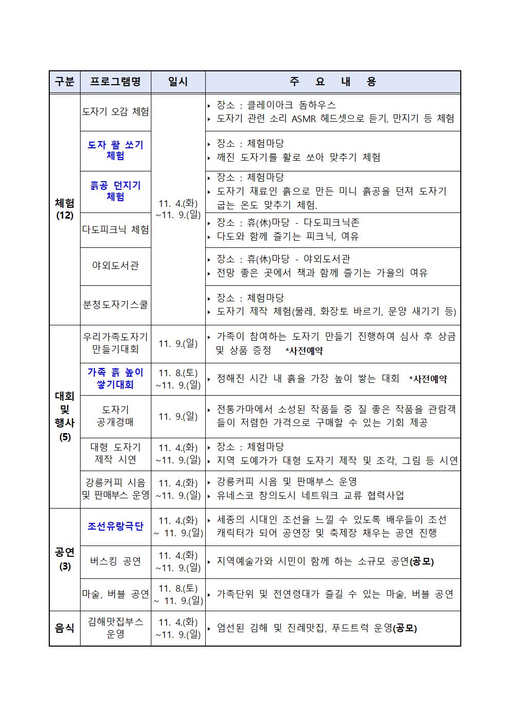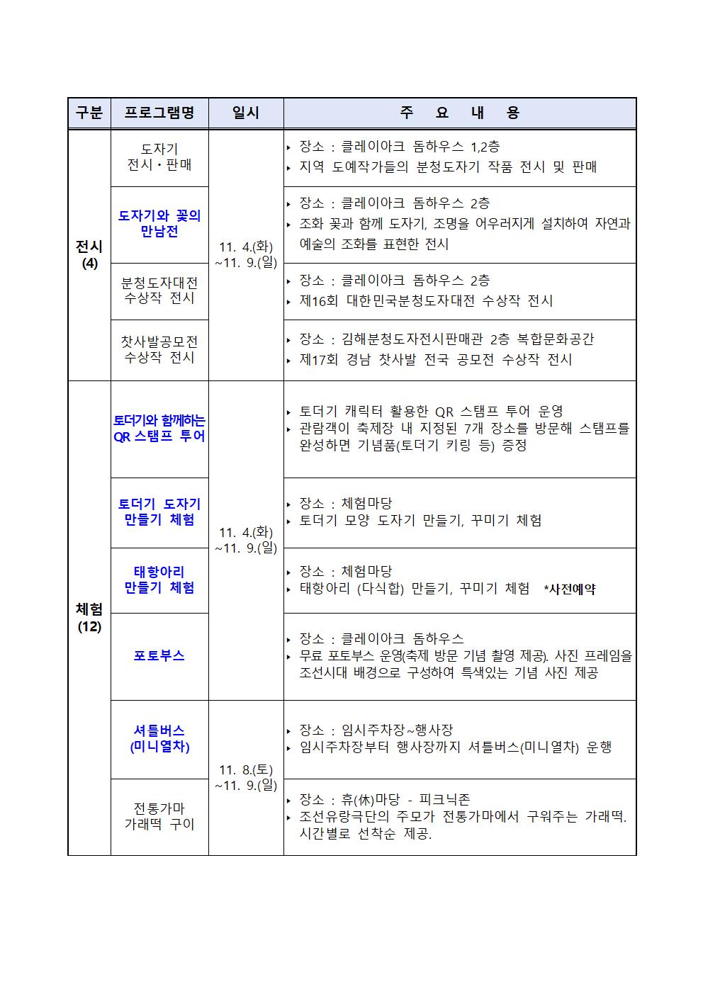 오는 11월4일~9일까지 개최되는 '제30회 김해분청도자기축제' 주요 행사 안내입니다.